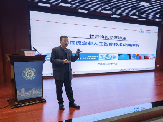 为洞悉行业前沿动态,引领学生把握人工智能时代物流业的发展脉搏,2025年11月6日下午,物流与供应链学院邀请中外运物流华中有限公司董事长周保昌来校开展物流企业人工智能技术应用探析的专题讲座,2025级现代物流管理、智能物流技术专业200余名师生参加讲座,讲座由物流与供应链学院党总支副书记、副院长汪志林主持