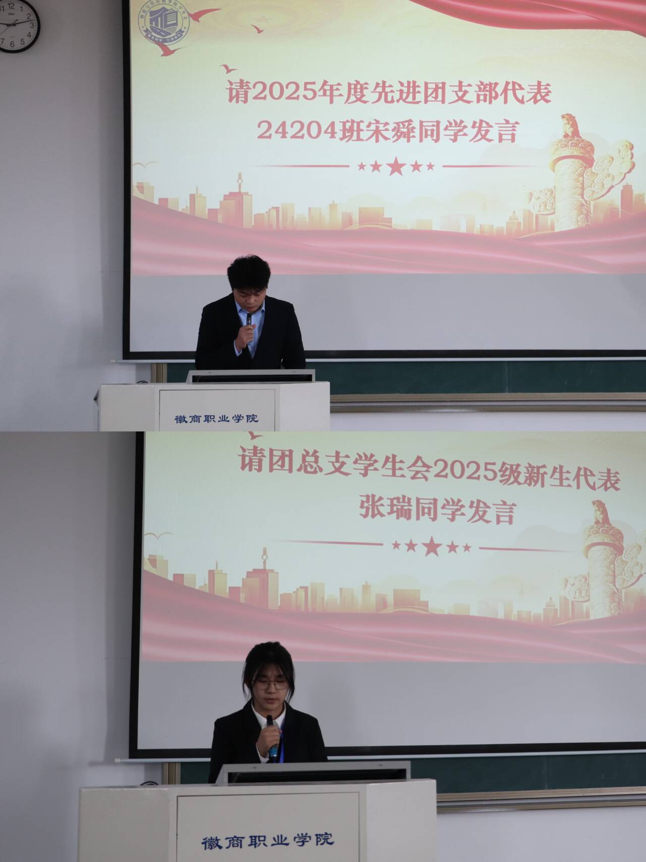 代表发言环节,2025年度先进团支部代表24204班宋舜同学分享了支部建设经验,展现了基层团组织的活力与担当。2025级新生代表张瑞同学则表达了加入学生组织的初心与展望,传递了新成员的青春热情。